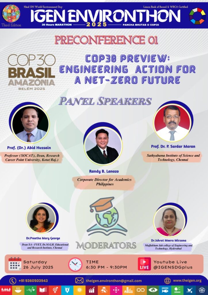Green invite to participate in the IGEN ENVIRONTHON 2025 Preconference 01, a thought-provoking discussion on “COP30 Preview: Engineering Action for a Net-Zero Future.” This event is part of the prestigious IGEN ENVIRONTHON 2025 conference.