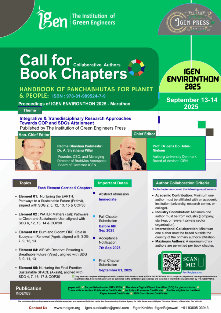 The Green IGEN Press β The Institution of Green Engineers (IGEN) is delighted to announce the upcoming publication of its first book, Handbook of Panchabhutas for Planet & People (ISBN: 978-81-989524-7-9). This volume, featuring 45 chapters, is being published as part of IGEN ENVIRONTHON 2025 β Marathon, with a focus on Integrative & Transdisciplinary Research Approaches Towards COP and SDGs Attainment.