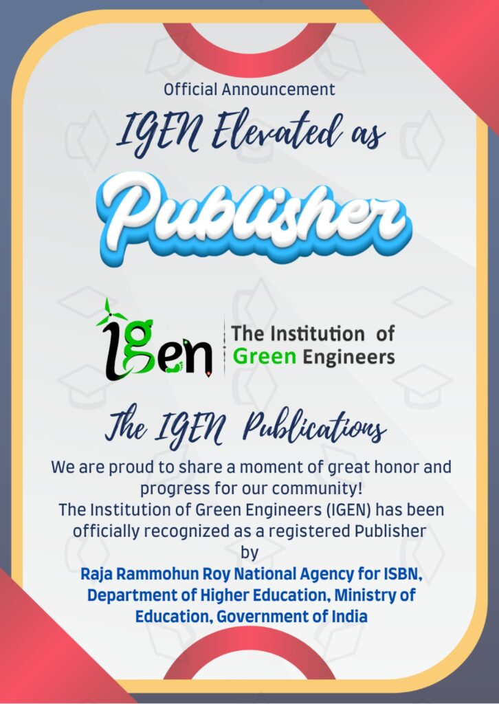 The Institution of Green Engineers (IGEN) has been officially recognized as a registered Publisher by the Raja Rammohun Roy National Agency for ISBN, Department of Higher Education, Ministry of Education, Government of India