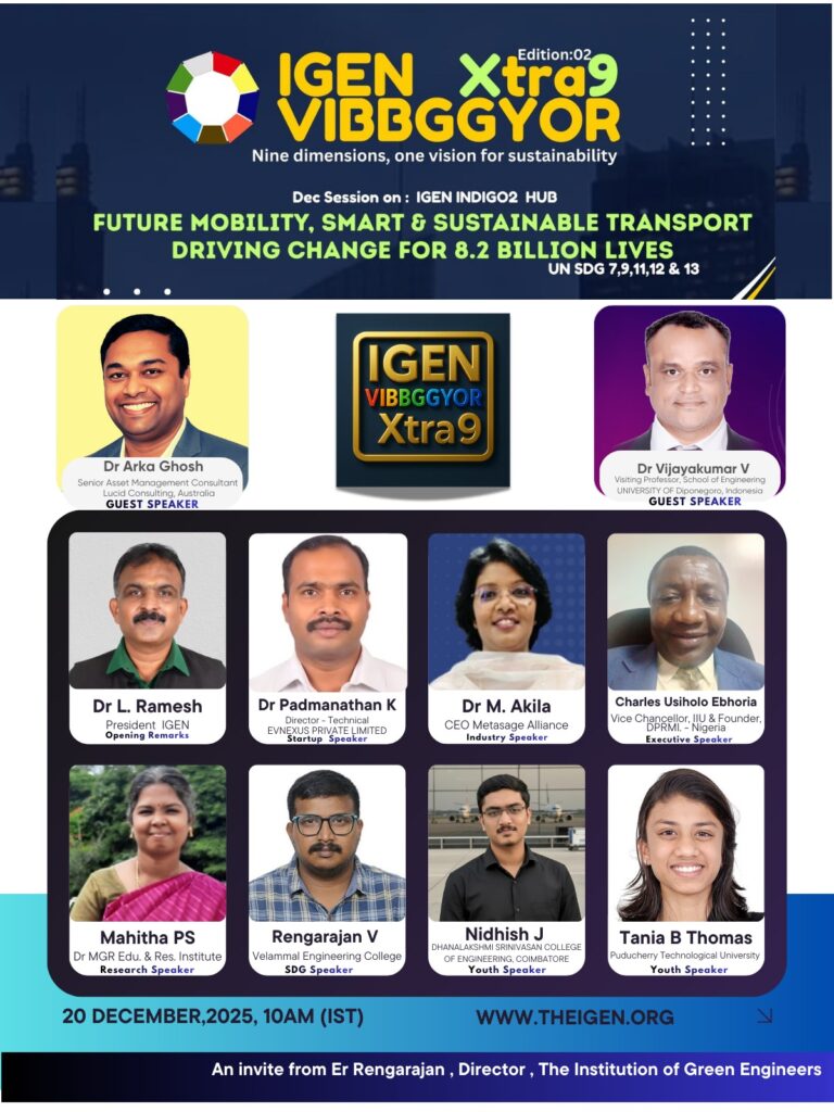 IGEN VIBBGGYOR Xtra9 is a monthly activity series by The Institution of Green Engineers (IGEN) focusing on the VIBBGGYOR Navarathnas and UN Sustainable Development Goals (SDGs). Each edition features nine core activities delivered without compromise, including the recognition of contributors making significant impacts in the respective theme — this month highlighting achievements in Waste Management.