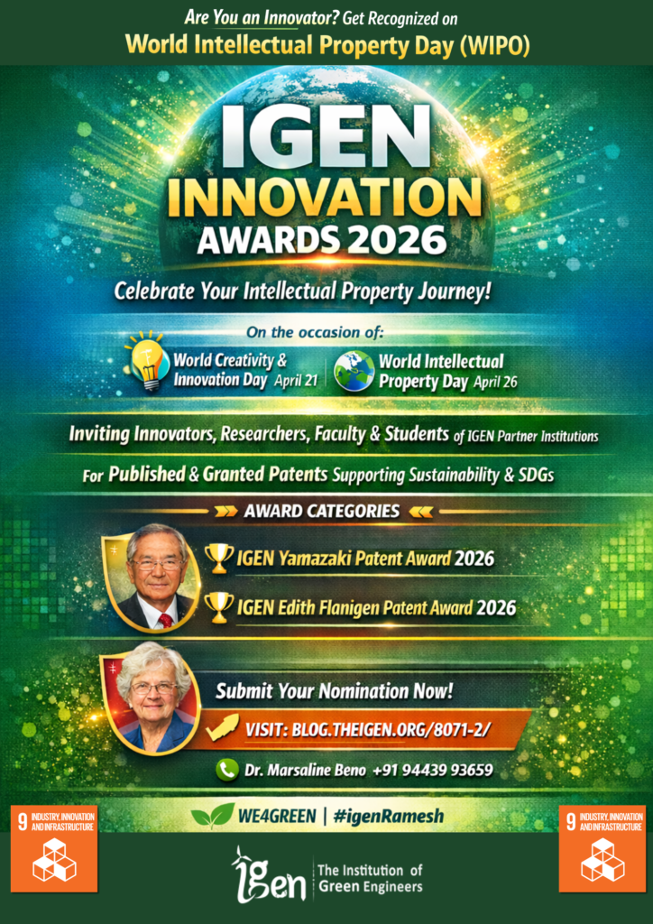 The Institution of Green Engineers (IGEN) invites nominations from its Partner Institutions to recognize outstanding contributions aligned to #sdg9 , innovation, patent publication, and granted patents.