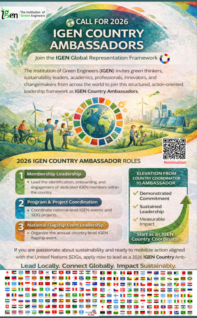 The Institution of Green Engineers (IGEN) invites green thinkers, sustainability leaders, academics, professionals, innovators, and changemakers from across the world to join the IGEN Global Representation Framework as IGEN Country Ambassadors. This structured, action-oriented leadership model is designed to expand the reach and impact of United Nations Sustainable Development Goals (SDG) initiatives at the national level, while leading and coordinating country-specific activities aligned with the IGEN VIBBGGYOR Hubs.