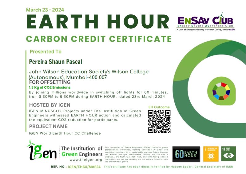 IGEN EARTH HOUR OUTCOME from 2024 to 2025 : The Institution of Green Engineers (IGEN) proudly shares the successful outcome of the Earth Hour 60 Initiative , which witnessed remarkable participation and measurable environmental impact. The event brought together 514 families and 2,056 individuals, all united in their commitment to energy conservation and climate action. During the Earth Hour, a total of 2,700 lights were switched off and 607 electrical equipment were powered down, resulting in a significant reduction of 715 kg of CO₂ emissions and saving approximately 550 units of electricity. The initiative also strengthened community engagement, with 600+ members actively connecting through the IGEN MINUSCO2 Facebook group, where all activities and outcomes were documented and shared. Event highlights and photos are available at the official group links, showcasing the collective effort and enthusiasm of participants. This impactful initiative demonstrates how small, conscious actions, when performed together, can lead to meaningful environmental change and contribute towards a more sustainable future.