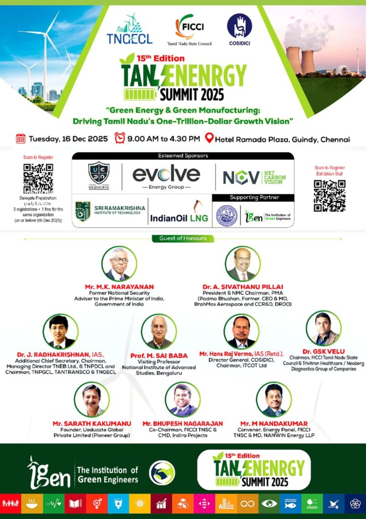 We are pleased to inform you that the FICCI Tamil Nadu State Council is organizing its 15th Edition of TANENERGY SUMMIT 2025 on 16th December 2025 at Hotel Ramada Plaza, Guindy, Chennai, theme of “Green Energy & Green Manufacturing: Driving Tamil Nadu’s One-Trillion-Dollar Growth Vision.” TANENERGY SUMMIT has been one of Tamil Nadu’s most influential annual platforms, bringing together government leaders, global experts, industry captains, innovators, investors, researchers, and technology providers. The summit aims to advance discussions on the next phase of Tamil Nadu’s energy transformation.