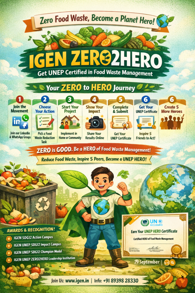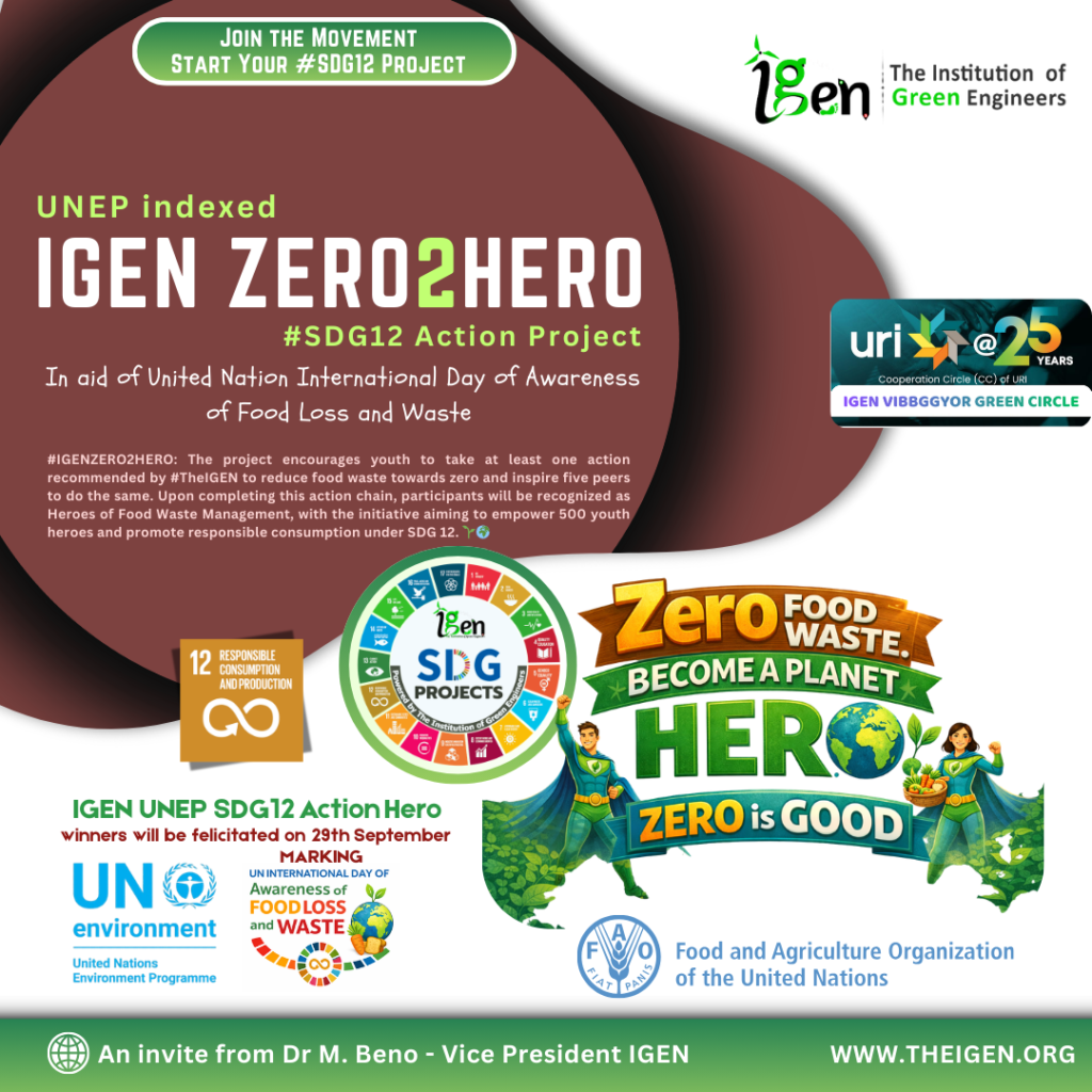Certified under the UNEP International Day of Awareness of Food Loss and Waste, The Institution of Green Engineers (IGEN), in association with URI CC – IGEN VIBBGGYOR Green Circle, is pleased to launch the project “IGEN ZERO2HERO” under the IGEN SDGProjects initiative, aligned with #SDG12 (Responsible Consumption and Production), with the objective of reducing food loss and waste towards zero by encouraging individuals, youth, and communities to adopt responsible consumption practices and take collective action for a more sustainable future. 🌍🌱