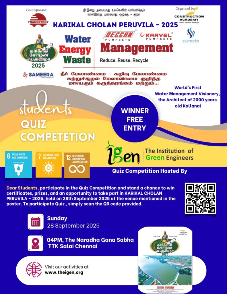 We are delighted to invite you to participate in the Students Quiz Competition, hosted by The Institution of Green Engineers, as part of KARIKAL CHOLAN PERUVILA – 2025, a grand celebration honoring the visionary water and energy management practices of the great Chola dynasty