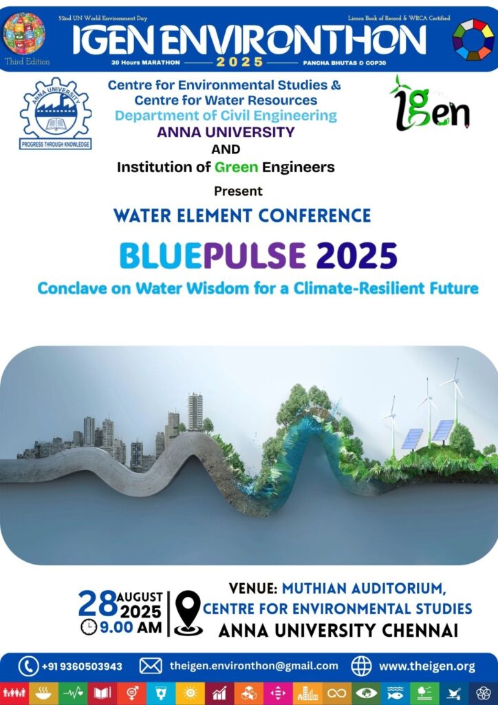 Participation in BLUEPULSE 2025 – Conclave on Water Wisdom for a Climate-Resilient Future is exclusive to: IGEN Green Partner affiliated colleges and IGEN ENSAVCLUB affiliated colleges. Only students, faculty, and members from these affiliated institutions will be eligible to attend the physical event at Anna University, Chennai.