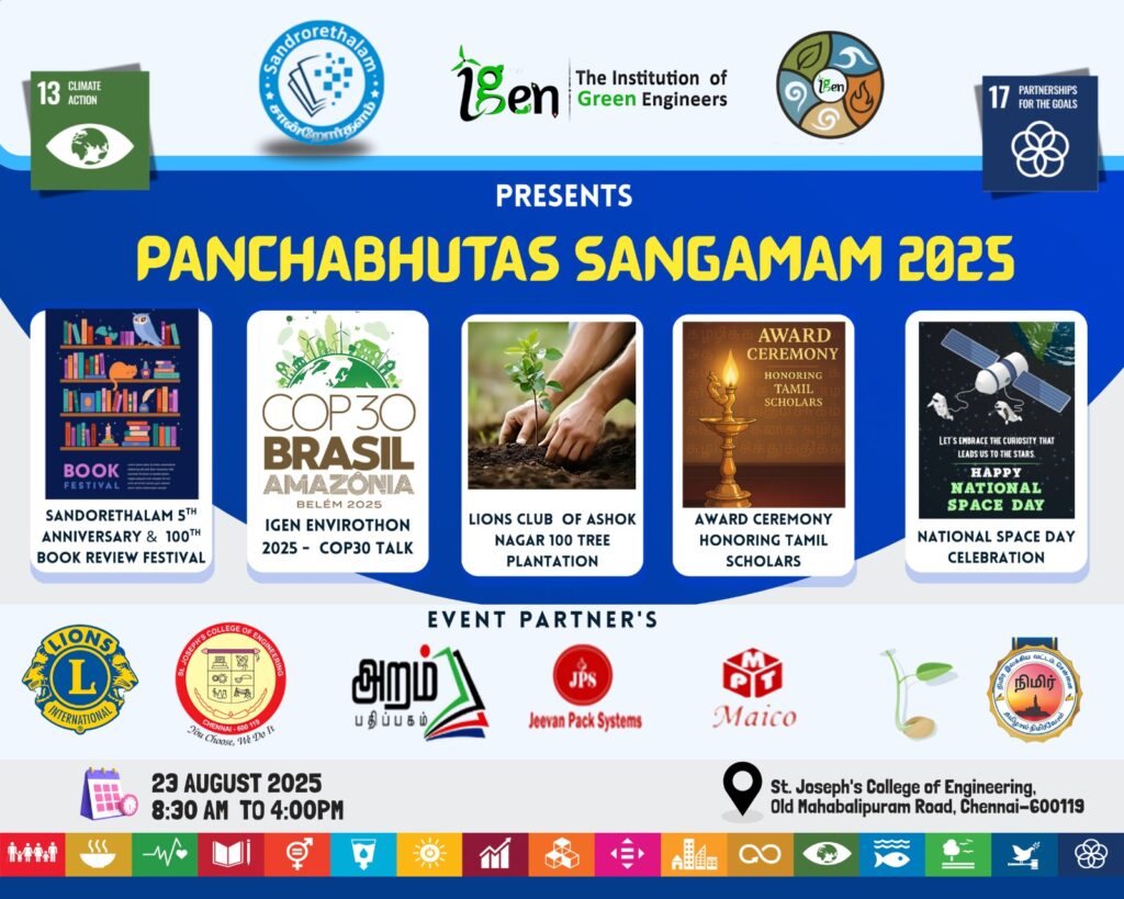 The Institution of Green Engineers & SANDORETHALAM cordially invites you to Panchabhutas Sangamam 2025 on 23rd August 2025, from 8:30 AM to 4:00 PM at St. Joseph’s College of Engineering, Old Mahabalipuram Road, Chennai.