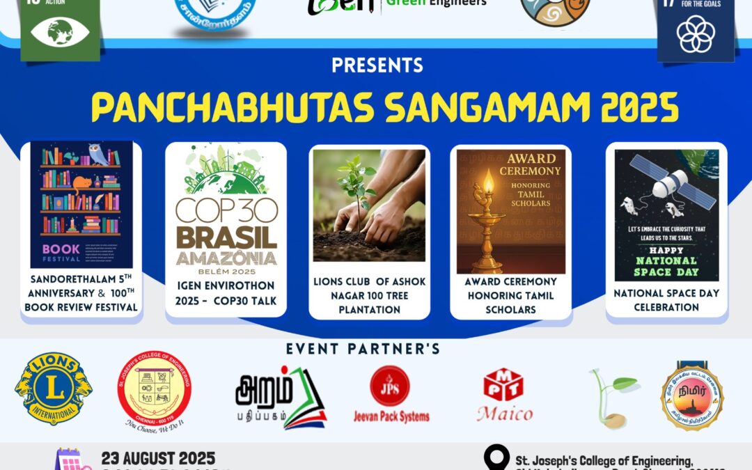 The Institution of Green Engineers & SANDORETHALAM cordially invites you to Panchabhutas Sangamam 2025 on 23rd August 2025, from 8:30 AM to 4:00 PM at St. Joseph’s College of Engineering, Old Mahabalipuram Road, Chennai.