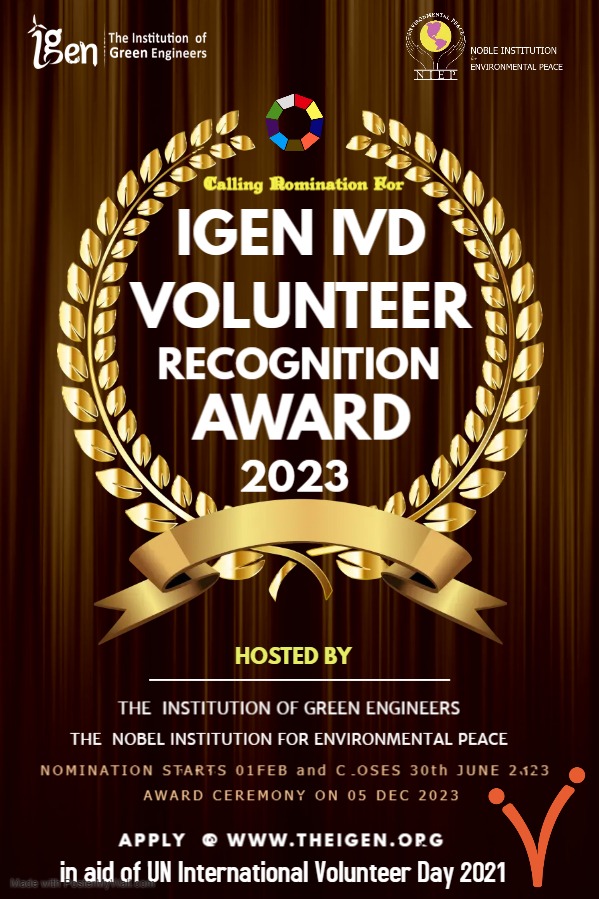 The Institution of Green Engineers and the Noble Institution for Environmental Peace are delighted to announce the second edition of the IGEN-IVD Volunteer Recognition Award 2023 in celebration of the United Nations International Volunteer Day (IVD), to acknowledge the contributions of volunteers who offer their skills, time, and enthusiasm to communities across the world.