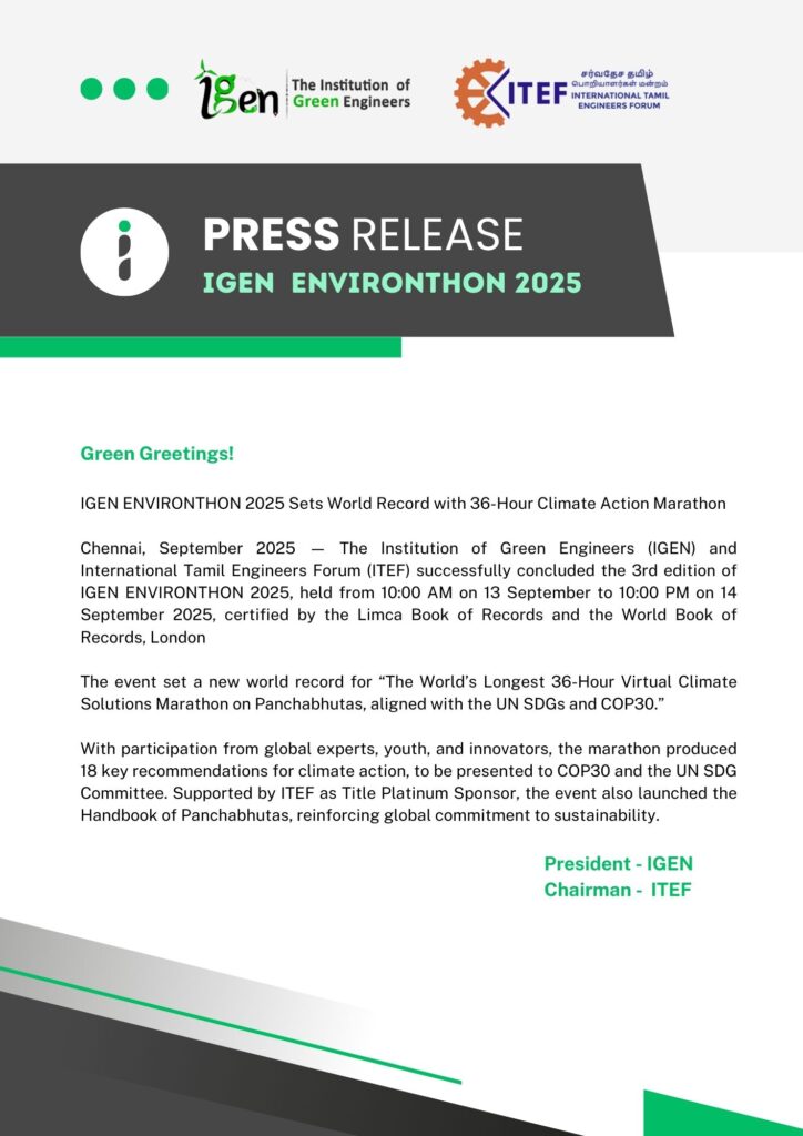 The marathon was organized by The Institution of Green Engineers (IGEN) and the International Tamil Engineers Forum (ITEF), with ITEF as the Title Platinum Sponsor. This record-setting initiative not only engaged global participants in continuous climate dialogue but also produced recommendations aligned with the United Nations Sustainable Development Goals (SDGs), contributing to the agenda of COP30 (Brazil, November 2025).