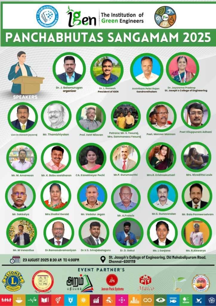 We are delighted to welcome all the distinguished speakers to the IGEN ENVIRONTHON 2025 Pre-Conclave – Panchabhutas Sangamam 2025, a confluence of sustainability, knowledge, and green innovation. Proudly organized by IGEN, in collaboration with Santhoorthalam and St. Joseph’s College of Engineering, the event on 23rd August 2025 will feature inspiring sessions, cultural milestones, and green initiatives, celebrating our shared commitment to a sustainable future.