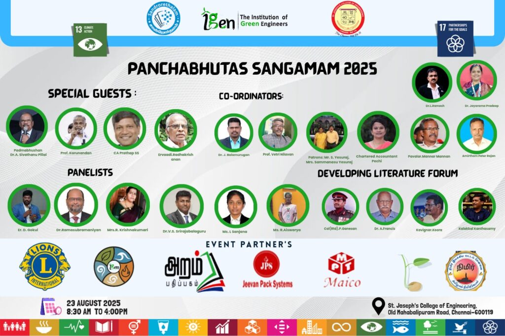 We are delighted to invite you to the IGEN ENVIRONTHON 2025 Pre-Conclave – Panchabhutas Sangamam 2025, a grand confluence of sustainability and green innovation. This prestigious event is proudly presented by The Institution of Green Engineers (IGEN) in collaboration with Santhoorthalam and St. Joseph’s College of Engineering.